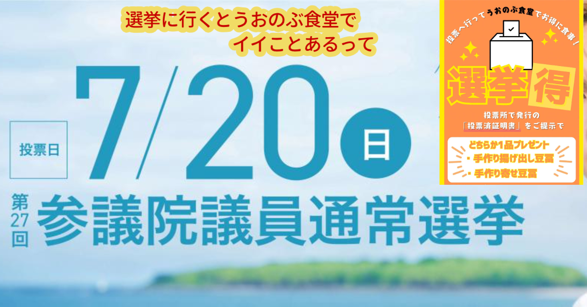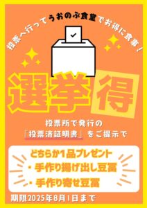 未分類 今日は投票日です \はじまります!選挙得キャンペーン/ こんにちは、うおのぶ食堂です 「投票に行って、うおのぶで得しよう!」 そんな気持ちで、今年もやっちゃいます! 【投票済証明書をご提示で】 \人気のおかずを1品プレゼント!/ ▶︎ 手作り揚げ出し豆冨 ▶︎ 手作り寄せ豆冨 どちらかお好きな方を、お食事の際にサービスしちゃいます 頑張って一票を届けた後は、お腹も心も満たしてくださいね♪ 対象期間:2025年8月1日(金)まで 期間中何度でもOK!(投票済証明書をご提示ください) この夏も“ちょうどいいごはん屋さん”として、 皆さまのご来店を楽しみにお待ちしております